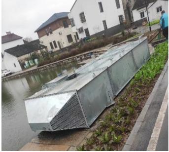 本产品为一体化水体人工强化原位水环境治理装备,基于生物膜水处理原理,融合了承载式固化生物膜原位净化技术、垂向水力循环除臭技术等,强化水中微生物作用,提高COD、氮等不同污染物的降解速度,实现黑臭水体的原位高效治理。